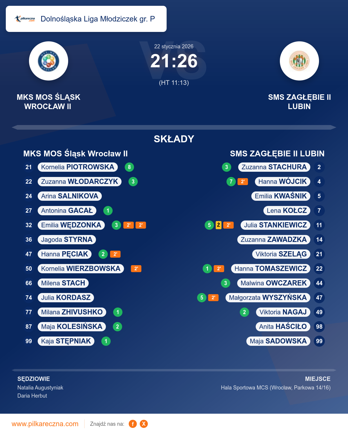 Zawodnicy: Kornelia Piotrowska (8), Emilia Wędzonka (3), Zuzanna Włodarczyk (3), Hanna Pęciak (2), Maja Kolesińska (2), Antonina Gacał (1), Kaja Stępniak (1), Milana Zhivushko (1), Arina Salnikova, Kornelia Wierzbowska, Milena Stach