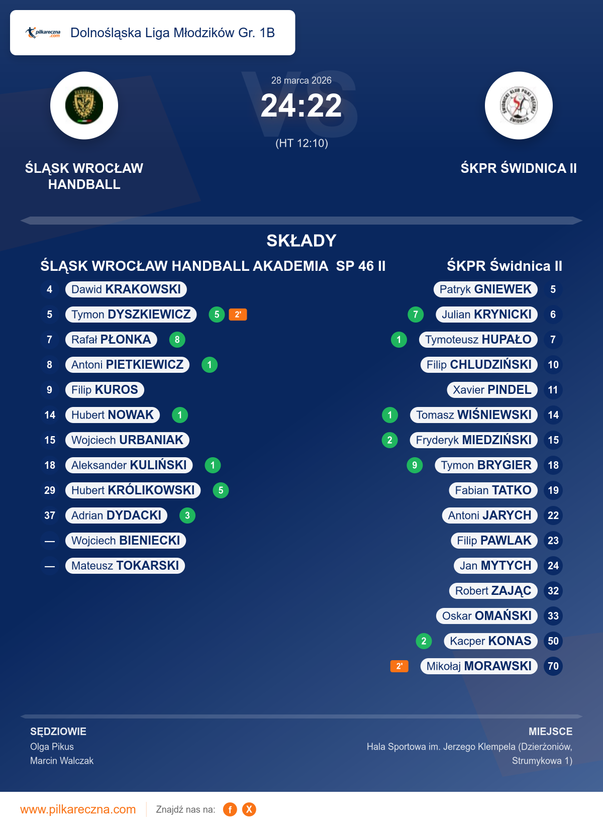 ŚLĄSK WROCŁAW HANDBALL AKADEMIA SP 46 II 24–22 ŚKPR Świdnica II