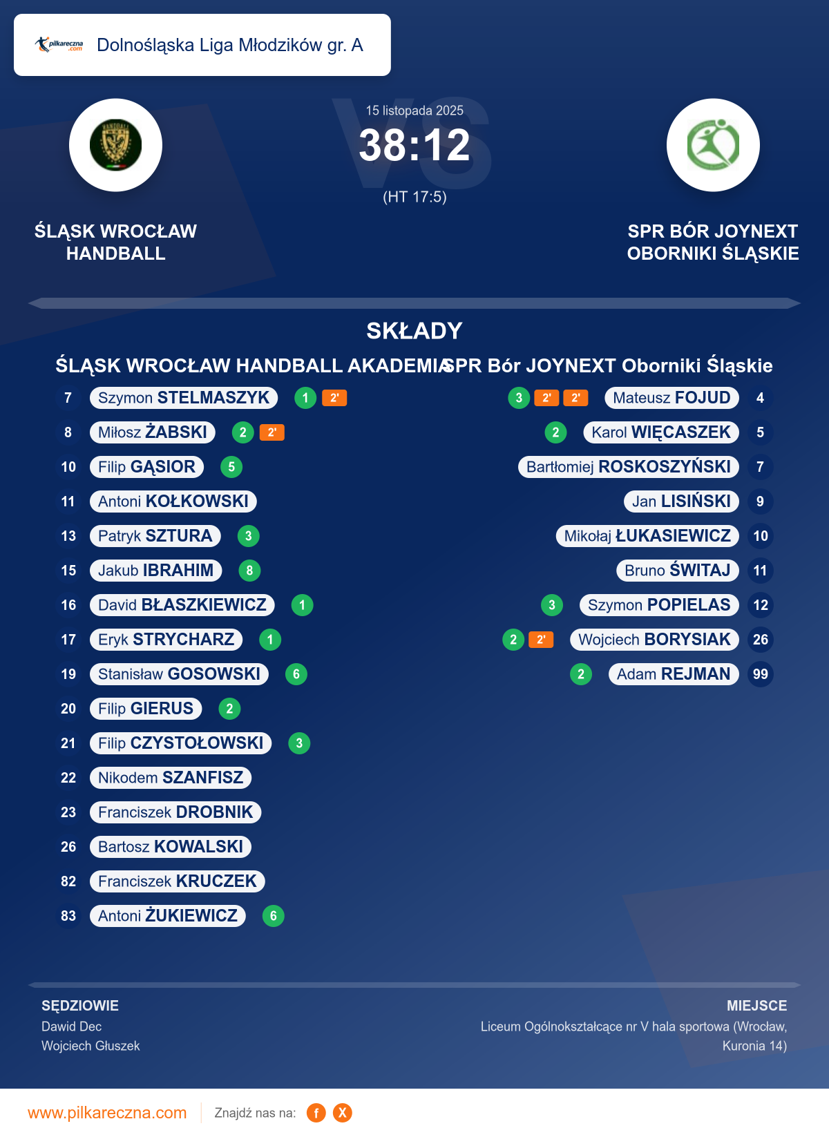 ŚLĄSK WROCŁAW HANDBALL AKADEMIA 38–12 SPR Bór JOYNEXT Oborniki Śląskie