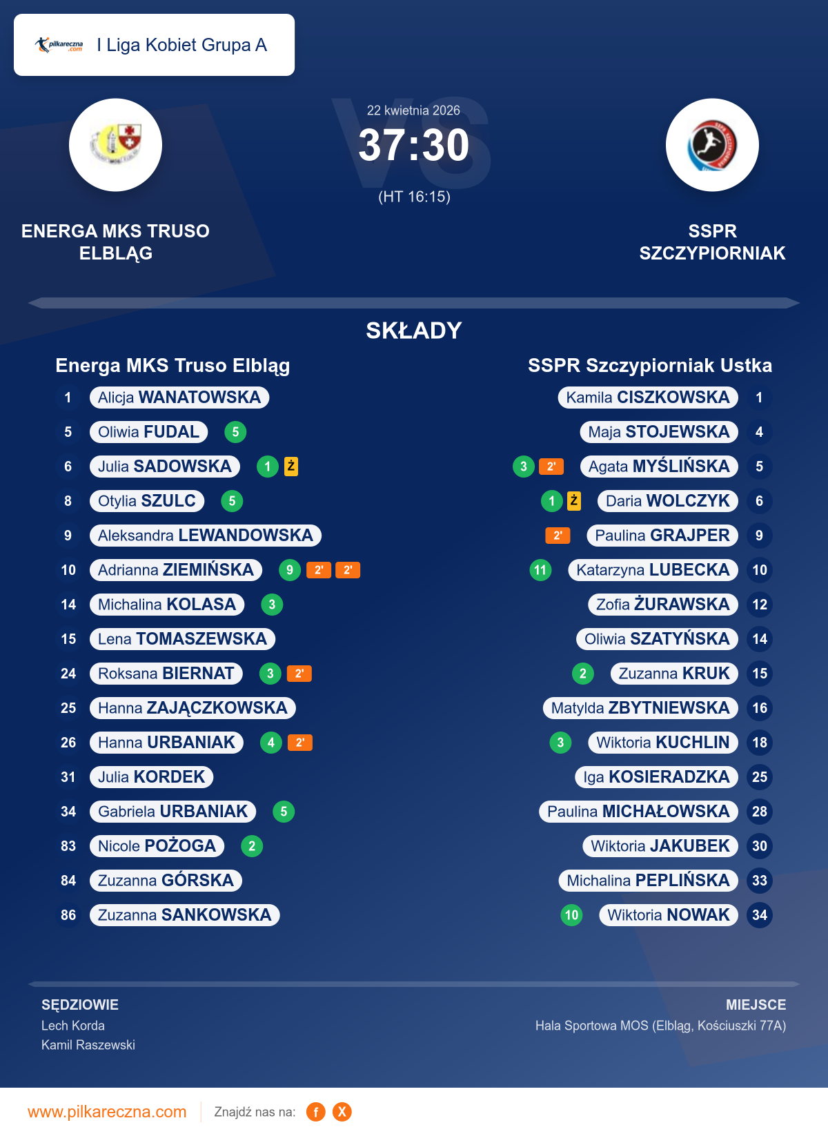 Wynik do przerwy: 16–15
