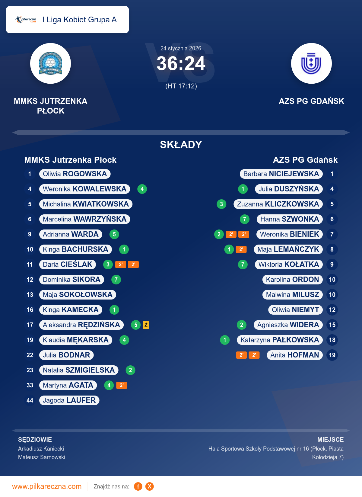 Uwagi: zawodniczka zespołu gospodarzy MMKS Jutrzenka Płock nr 44