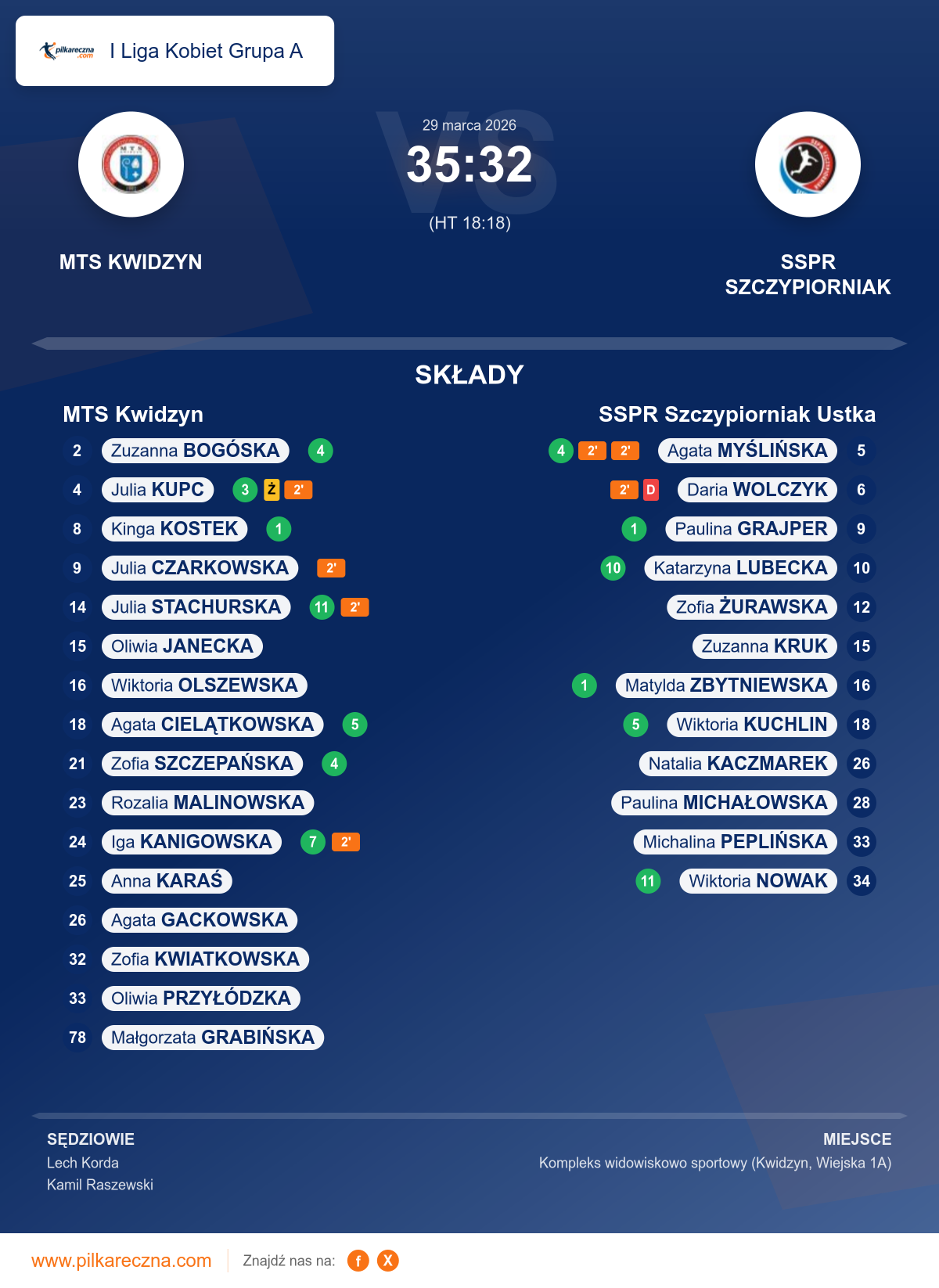Uwagi: zawodniczka drużyny gospodarzy (MTS Kwidzyn) grająca z nr 2 BOGÓSKA Zuzanna doznała kontuzji prawej ręki. W 49:35 min. zawodniczka drużyny gości (SSPR Szczypiorniak Ustka) grająca z nr 6 WOLCZYK Daria otrzymała karę dyskwalifikacji za atak na szyję zgodnie z przepisem 8.5b. Zawodniczka drużyny gości (SSPR Szczypiorniak Ustka) grająca z nr 12