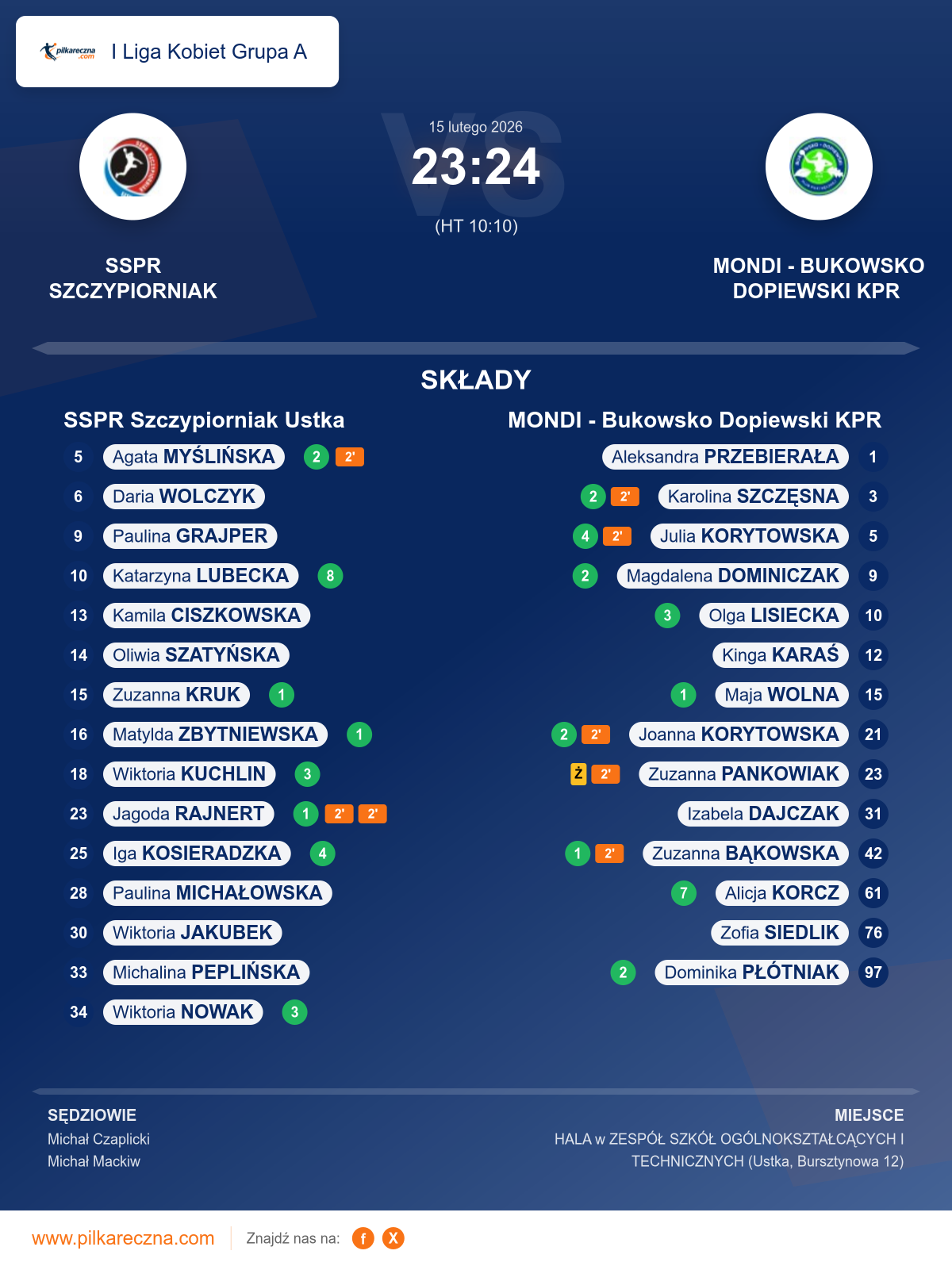 Uwagi: w trakcie spotkania kontuzje odniosły zawodniczki MONDI - Bukowsko Dopiewski KPR: 1) WOLNA Maja (nr 15) - kontuzja lewego kolana, 2) LISIECKA Olga (nr 10) - kontuzja prawej ręki, 3) DAJCZAK Izabela (nr 31) - kontuzja lewej ręki