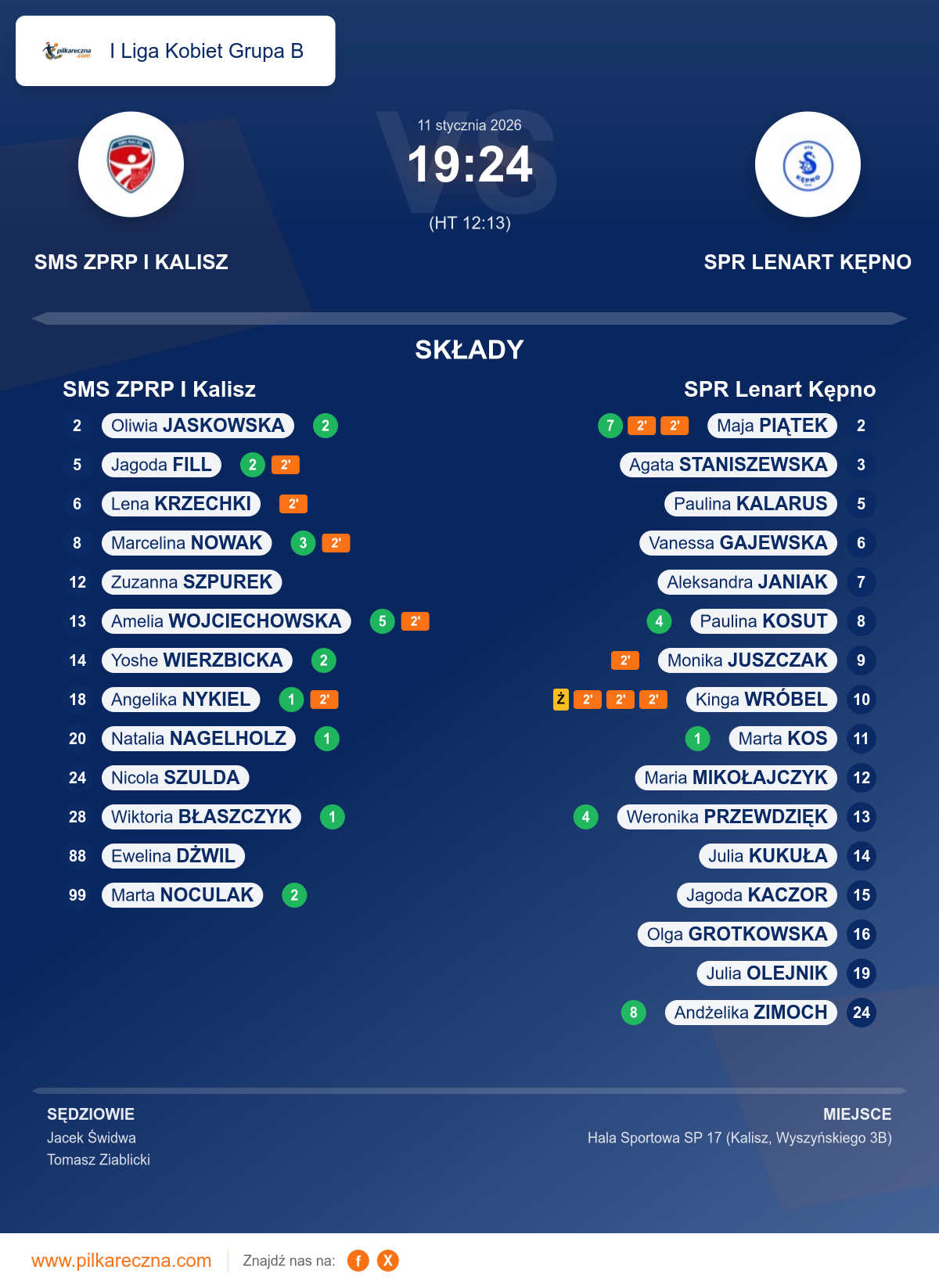 Uwagi: W trakcie spotkania, zawodniczka drużyny gości SPR Lenart Kępno oznaczona nr 6 (GAJEWSKA Vanessa) doznała urazu prawego kolana. SPR Lenart Kępno