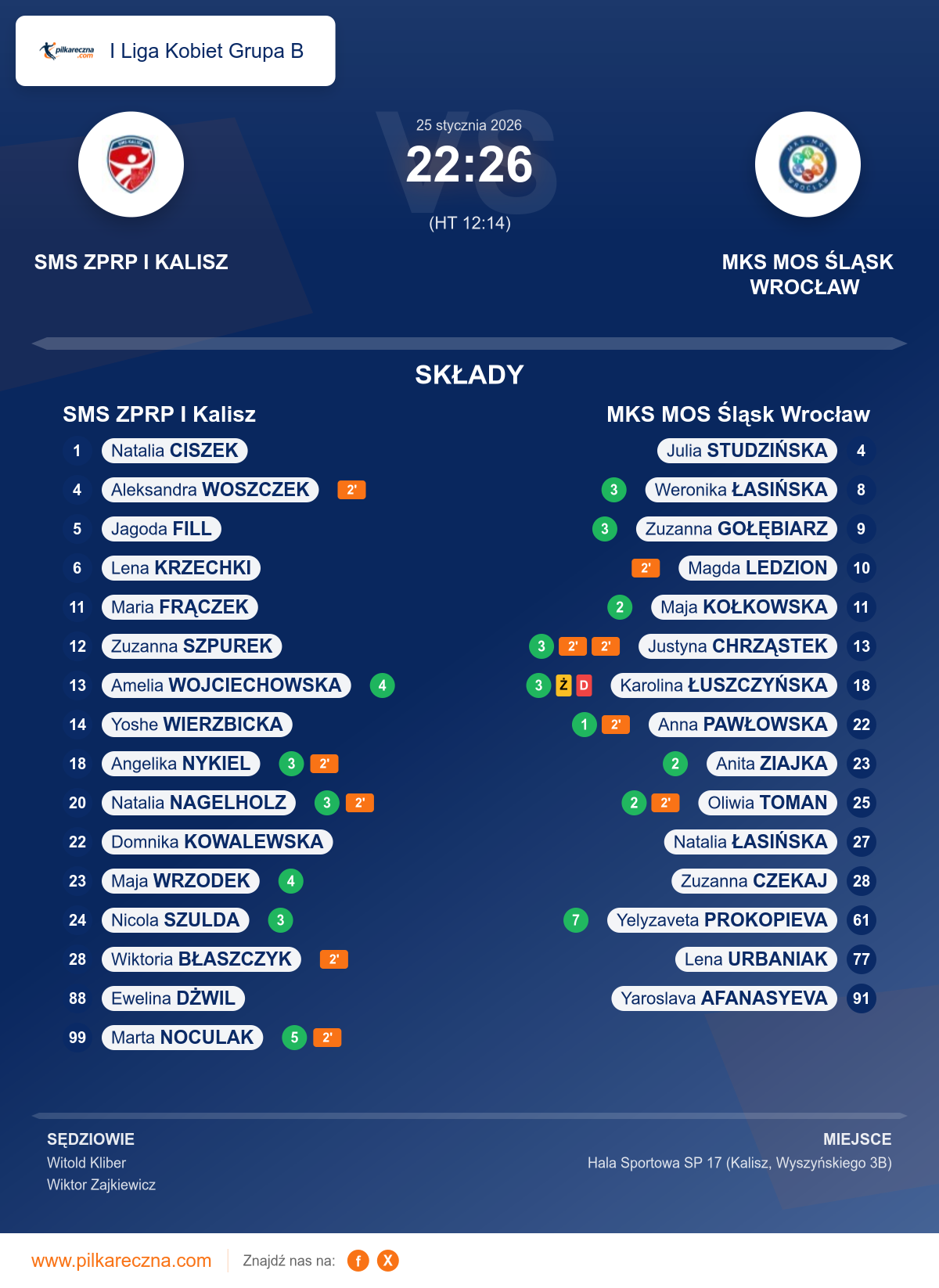 Uwagi: w 34:51 zawodniczka drużyny gości MKS MOS Śląsk Wrocław ŁUSZCZYŃSKA Karolina (nr 18) otrzymała karę dyskwalifikacji za atak zawodniczki drużyny przeciwnej na prostą rękę kiedy ta znajdowała się w wyskoku (przepis 8.5a) W trakcie spotkania zawodniczka drużyny gospodarzy SMS ZPRP I Kalisz nr 14 WIERZBICKA Yoshe doznała kontuzji prawej ręki