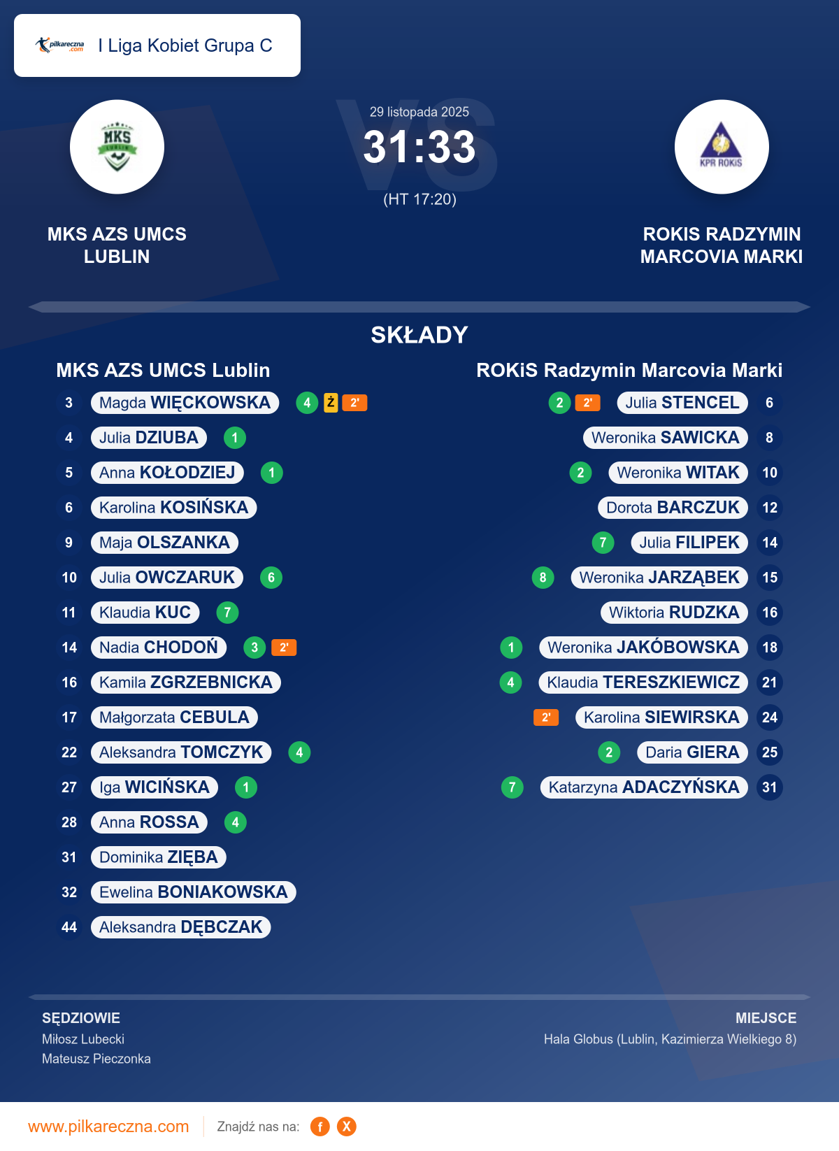 Uwagi: zawodniczka drużyny MKS AZS UMCS Lublin nr 31 ZIĘBA Dominika doznała urazu prawej kostki