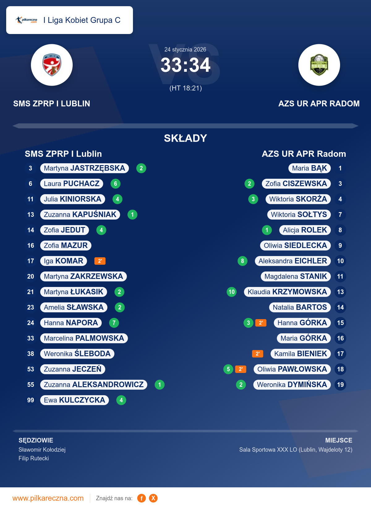 Uwagi: W 9:08 meczu zawodniczka zespołu "A" (SMS ZPRP I Lublin) grająca z numerem 17 KOMAR Iga otrzymała karę dyskwalifikacji