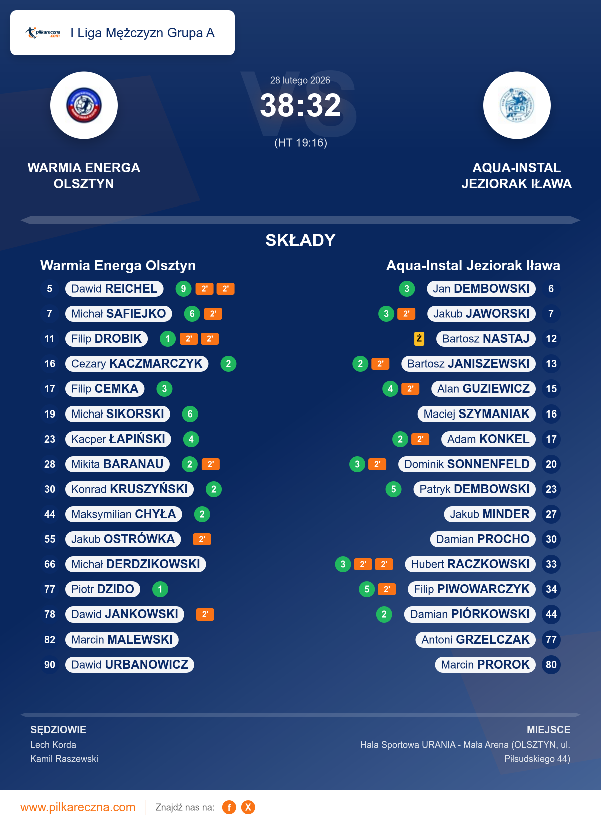 Warmia Energa Olsztyn 38–32 Aqua-Instal Jeziorak Iława