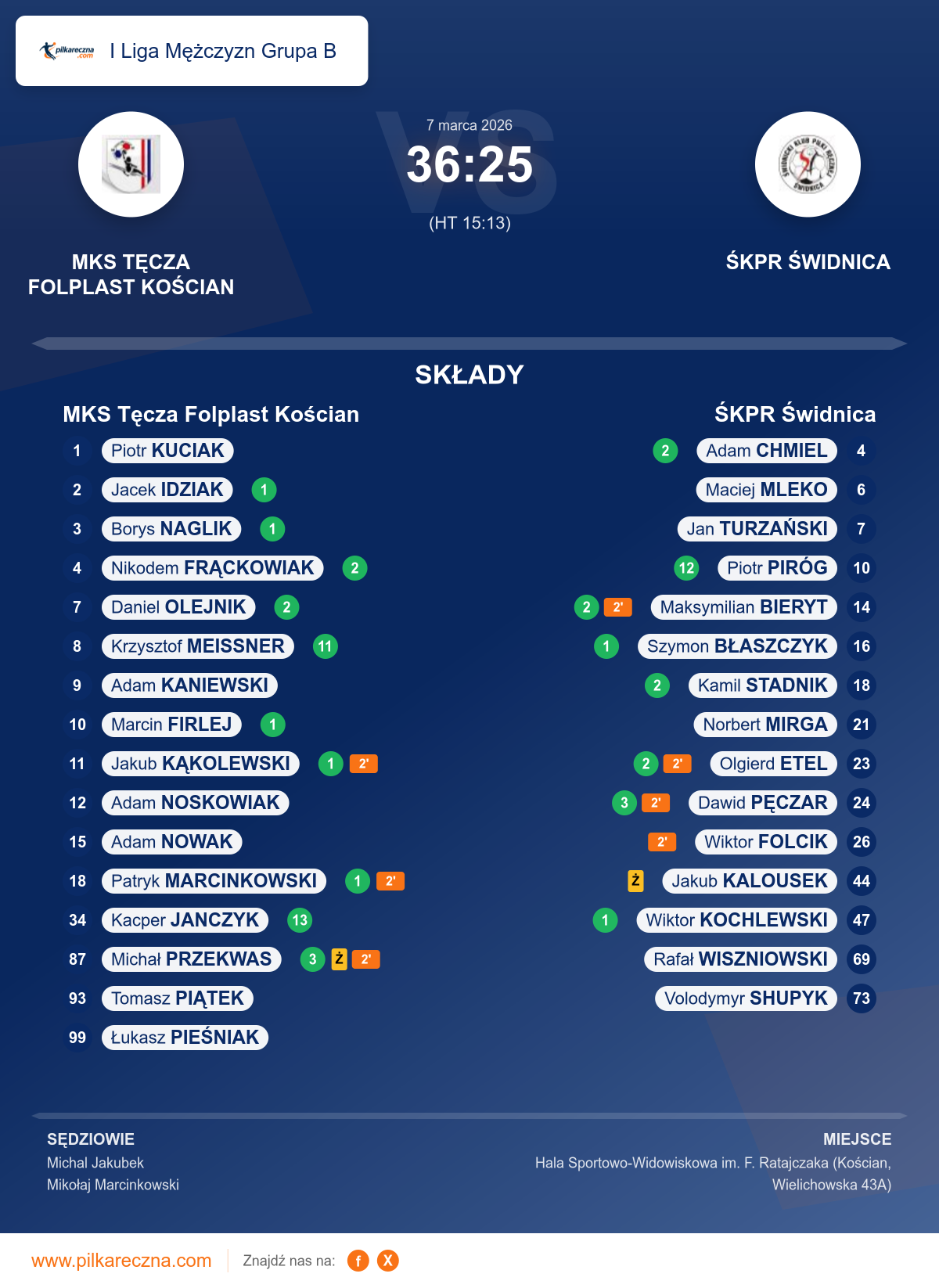 MKS Tęcza Folplast Kościan 36–25 ŚKPR Świdnica
