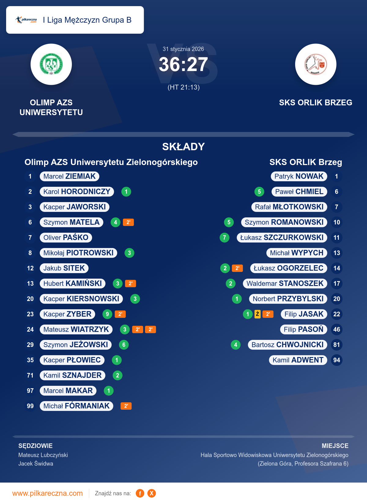 Olimp AZS Uniwersytetu Zielonogórskiego 36–27 SKS ORLIK Brzeg