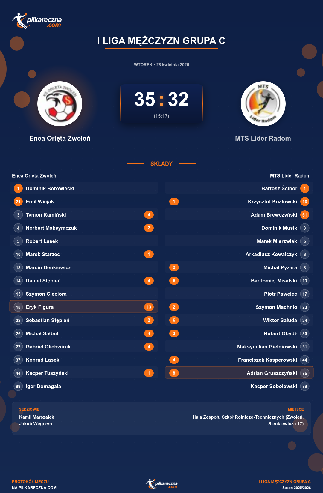 Sędziowali: Kamil Marszałek, Jakub Węgrzyn
