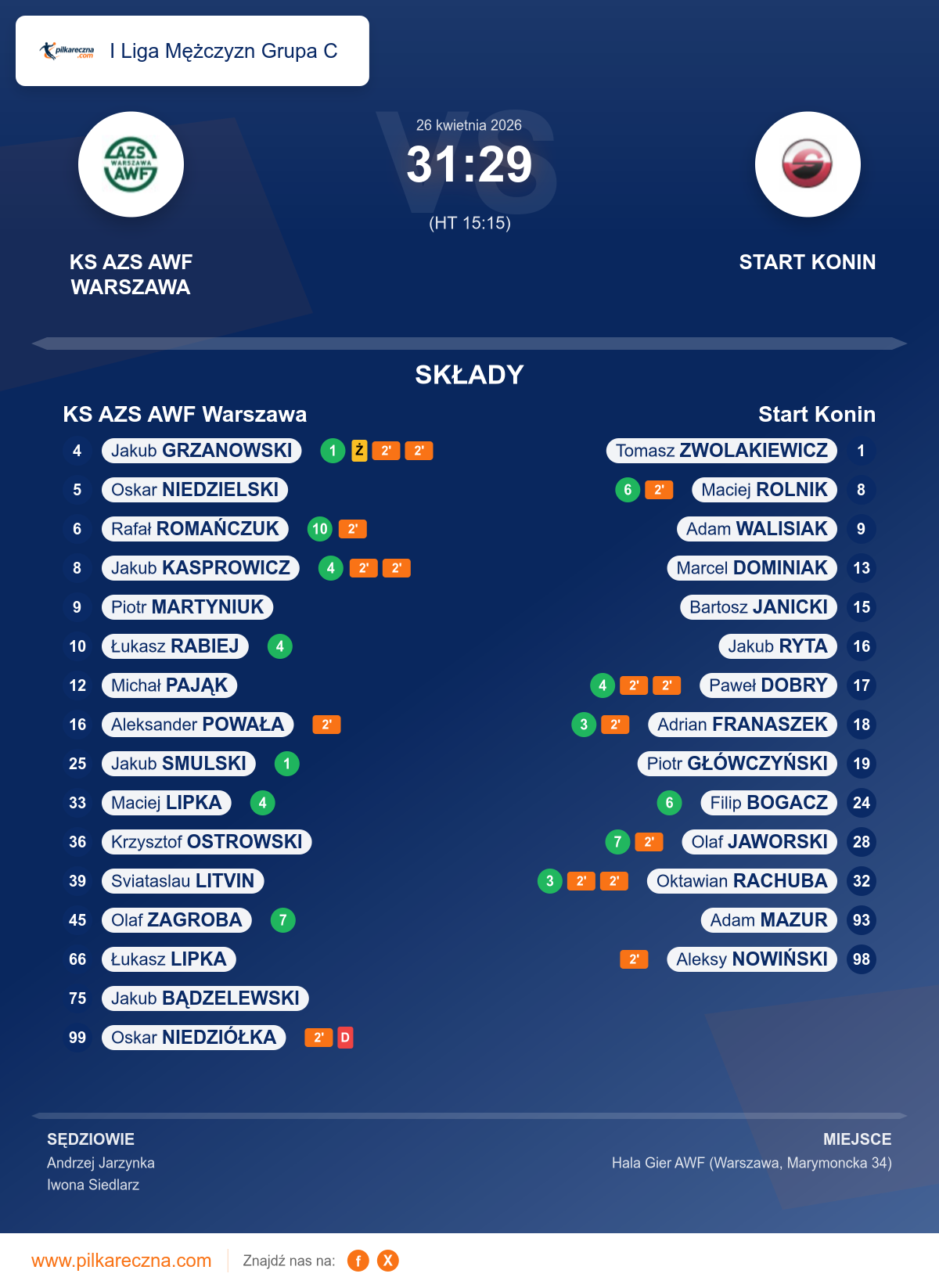 Uwagi: W 46 minucie i 45 sekundzie meczu zawodnik drużyny KS AZS AWF Warszawa nr 99 Niedziółka Oskar otrzymał karę dyskwalifkacji na podstawie przepisu 8:6a tj. szczególnie niebezpieczne zagranie w wyniku którego, zawodnik drużyny przeciwnej doznał niebezpiecznej kontuzji. Zawodnik druzyny Start Konin nr 32 Rachuba Oktawian, doznał urazu kolana lewej nogi. Po udzieleniu opieki medycznej zawodnik ten nie uczestniczył w dalszej części meczu.