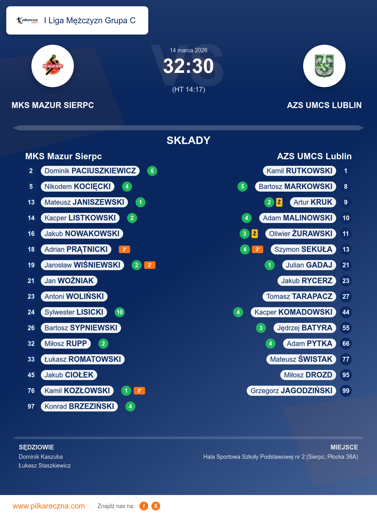 Uwagi: W pierwszej połowie meczu urazu lewej nogi doznał zawodnik zespołu AZS UMCS Lublin - Malinowski Adam nr 10.