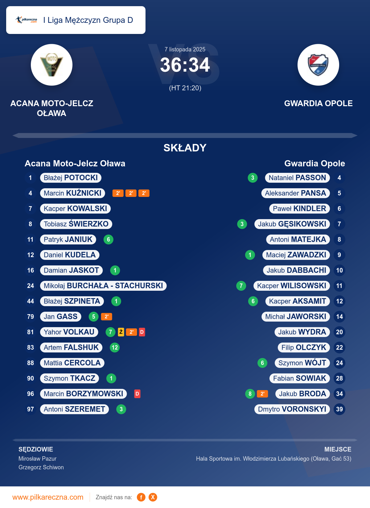 Uwagi: Zawodnik z zespołu Acana Moto-Jelcz Oława z nr 96 Borzymowski Marcin w 47 minucie 50 sekundzie otrzymał karę dyskwalifikacji zgodnie z przepisem 8:5a utrata kontroli nad swoim ciałem podczas wykonywania rzutu, pociągnięty za rękę. Zawodnik z zespołu Acana Moto-Jelcz Oława z nr 81 Volkau Yahor w 58 minucie 36 sekundzie otrzymał karę dyskwalifikacji zgodnie z przepisem 8:5b szczególnie agresywna akcja przeciwko zawodnikowi drużyny przeciwnej.