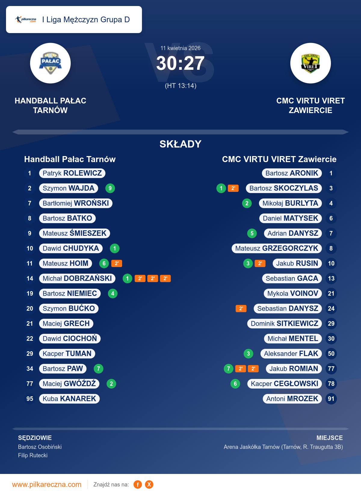 Uwagi: W 52 min. meczu trener zespołu gospodarzy (Handball Pałac Tarnów) p. Marcin Janas otrzymał upomnienie na podstawie przepisu 8:7a - krytykowanie orzeczeń sędziowskich.