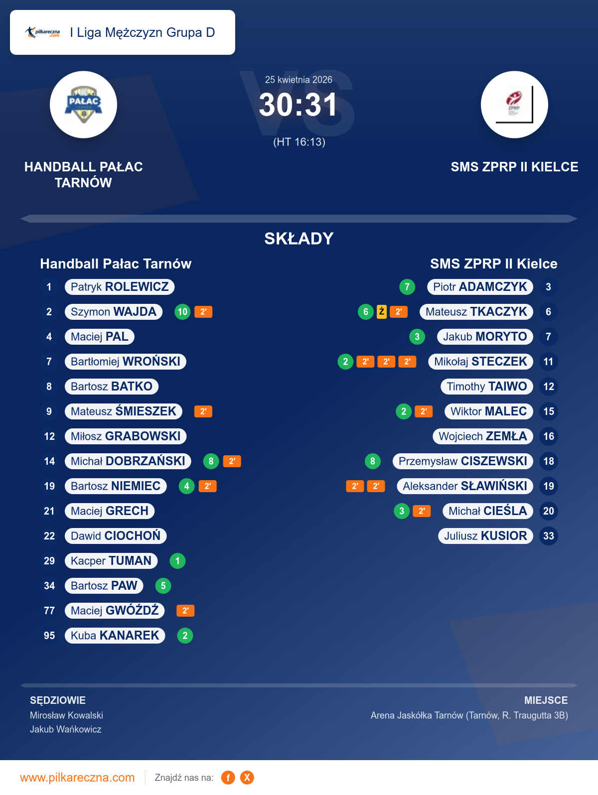 Wynik: 30–31 (HT 16–13)