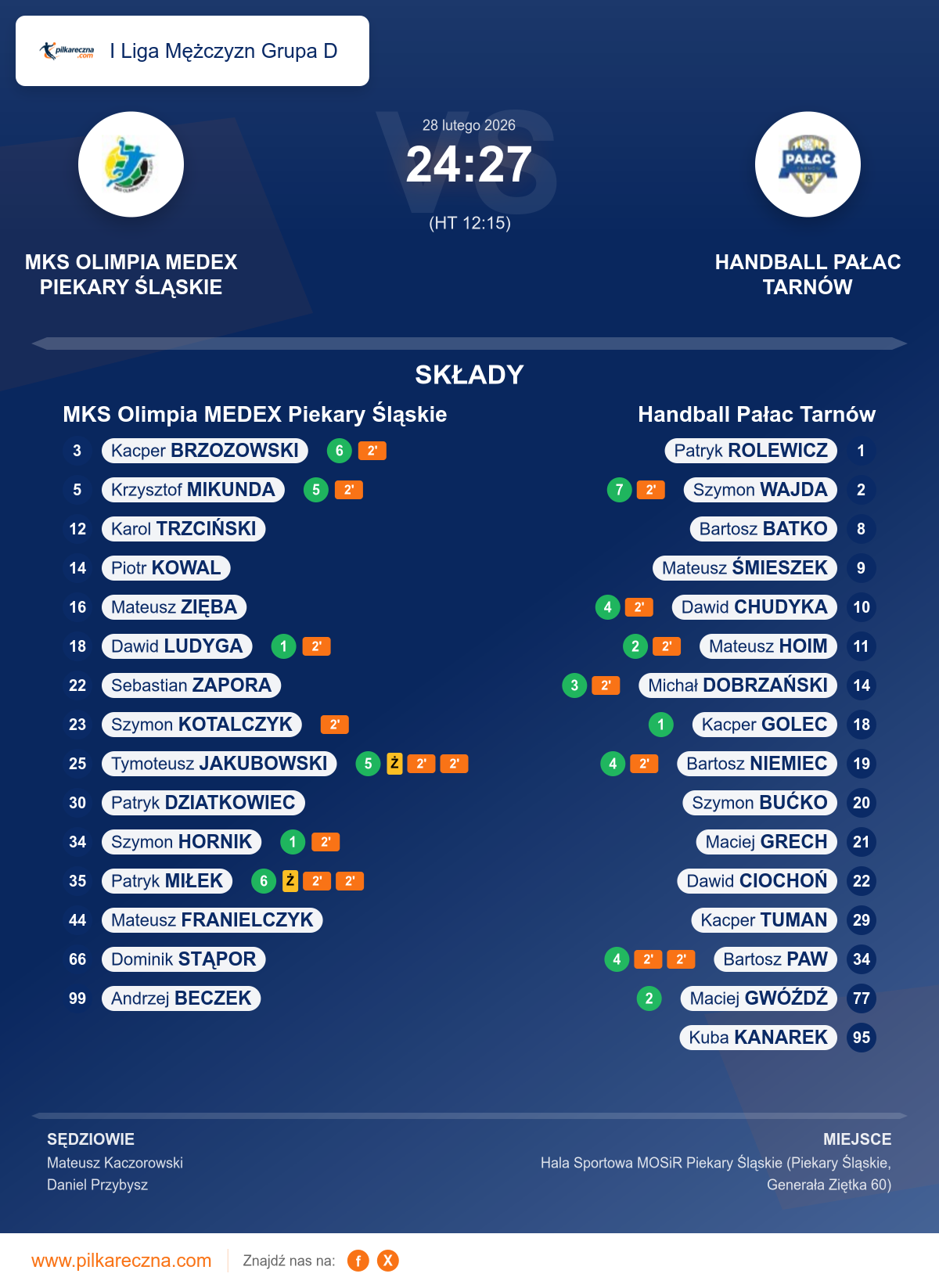 MKS Olimpia MEDEX Piekary Śląskie 24–27 Handball Pałac Tarnów