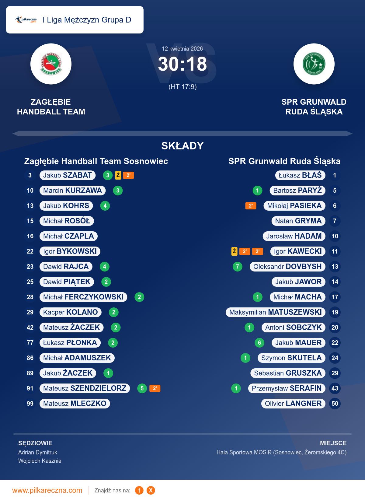 Zagłębie Handball Team Sosnowiec 30–18 SPR Grunwald Ruda Śląska