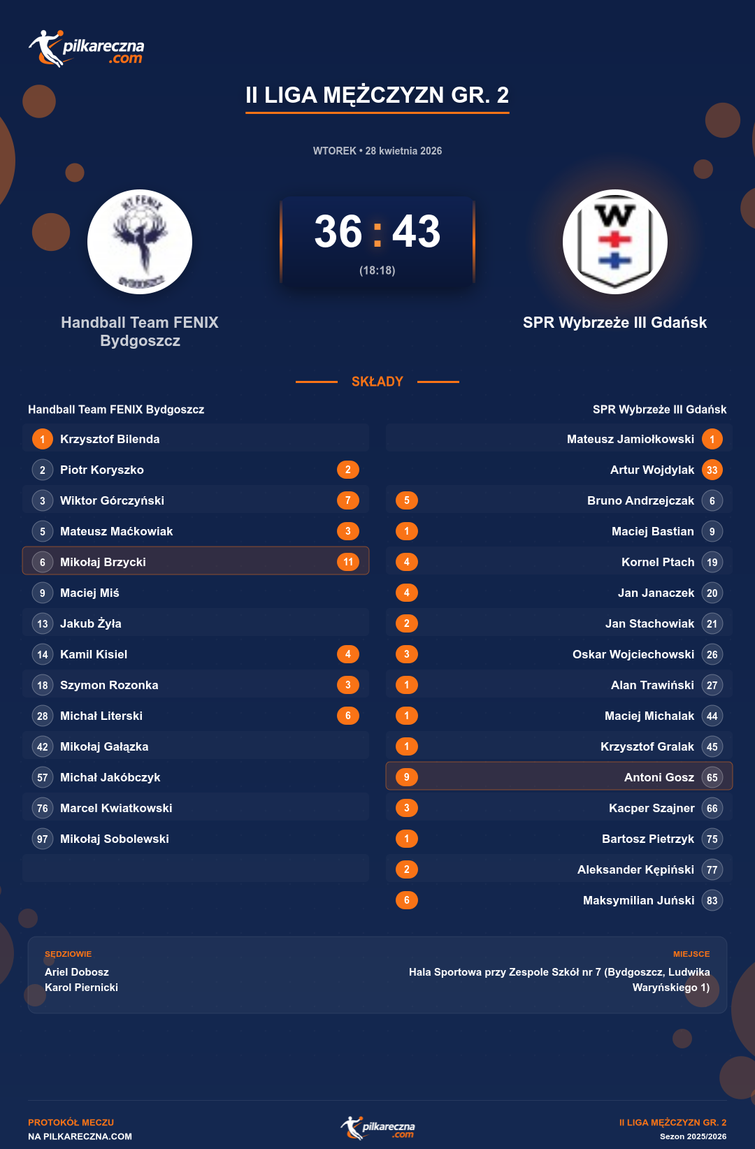 Handball Team FENIX Bydgoszcz 36–43 SPR Wybrzeże III Gdańsk
