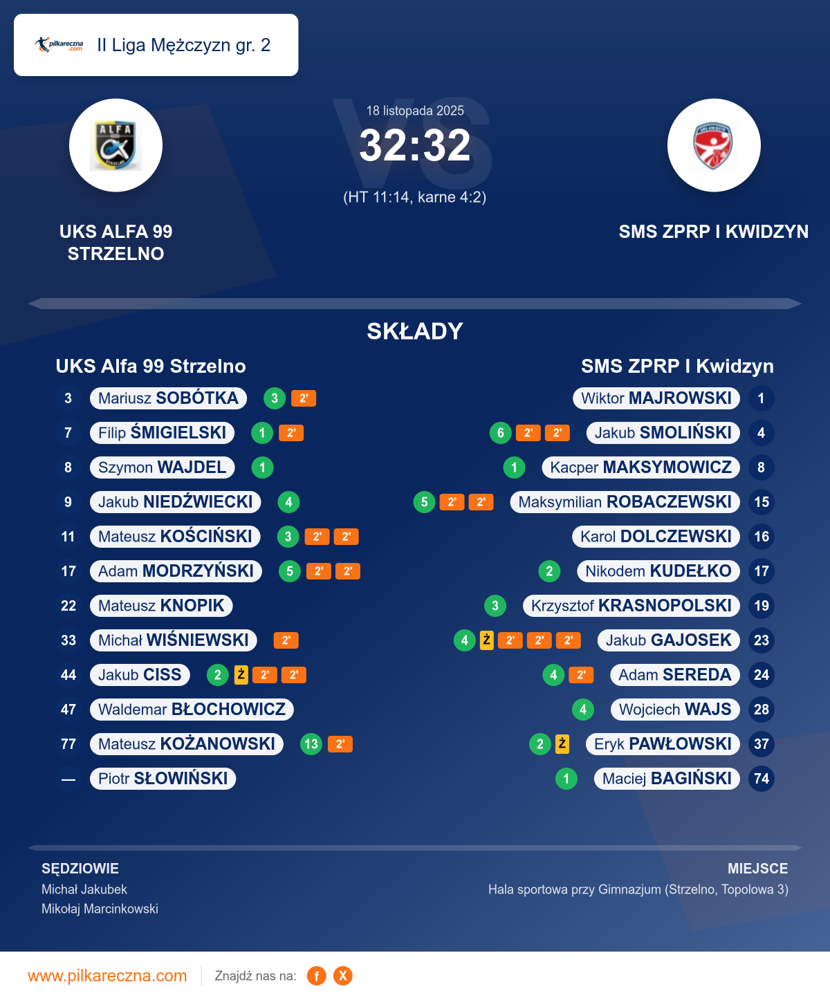 Wynik: 32–32 (HT 11–14), po karnych 4–2
