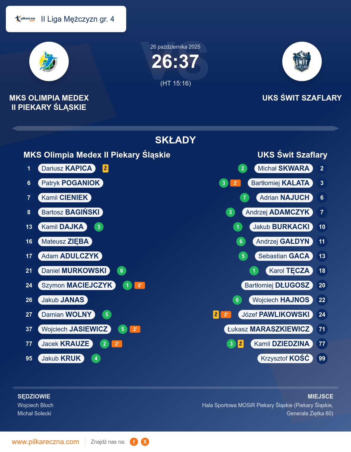 MKS Olimpia Medex II Piekary Śląskie 26–37 UKS Świt Szaflary