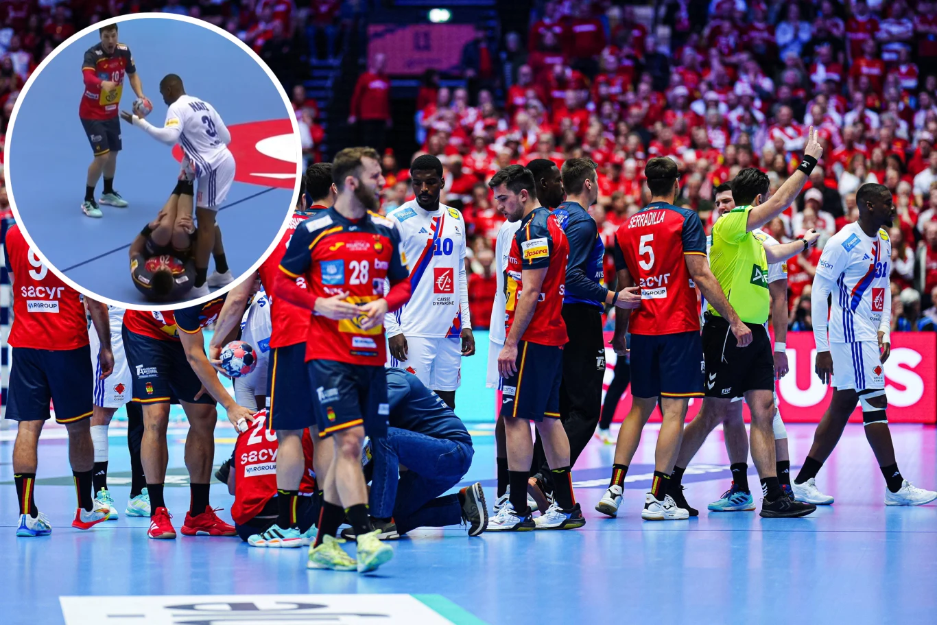 Na pół minuty przed zakończeniem spotkania wynik był już przesądzony - Ludovic Fabregas ustalił wówczas wynik na 32:35 z perspektywy "Trójkolorowych". Hiszpanie wznawiiali grę od środka, ich obrotowy Abel Serdio podał futbolówkę i zmierzał do ławki rezerwowych. W bezpośredniej bliskości próbował minąć Dylana Nahiego, który wystawił biodro, a następnie bark, mocno trącając przeciwnika. Serdio niekorzystnie upadł, z przeprostem w kolanie, co groziło poważnym urazem. Dodatkowo wyglądało, jakby chciał kopnąć Francuza. Natychmiast wybuchło zamieszanie, ostatecznie Serdio nie powrócił na parkiet, a Nahi otrzymał drugą dwuminutową karę. Hiszpania zwyciężyła 36:32.
