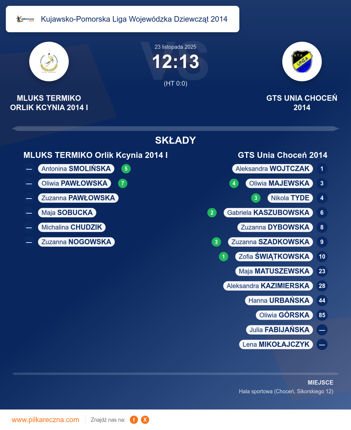 Zawodnicy: Oliwia Majewska (4), Nikola Tyde (3), Zuzanna Szadkowska (3), Gabriela Kaszubowska (2), Zofia Świątkowska (1), Aleksandra Kazimierska, Aleksandra Wojtczak, Hanna Urbańska, Julia Fabijańska, Lena Mikołajczyk, Maja Matuszewska, Oliwia Górska, Zuzanna Dybowska