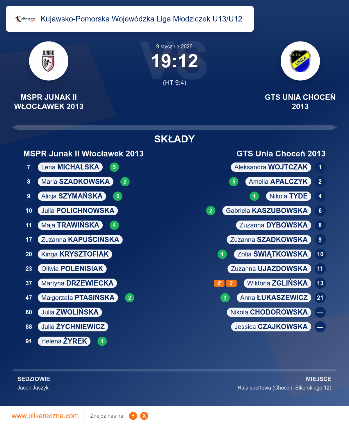 Zawodnicy: Amelia Apalczyk (5), Anna Łukaszewicz (3), Gabriela Kaszubowska (2), Nikola Tyde (1), Zofia Świątkowska (1), Aleksandra Wojtczak, Jessica Czajkowska, Nikola Chodorowska, Wiktoria Zglińska, Zuzanna Dybowska, Zuzanna Szadkowska, Zuzanna Ujazdowska