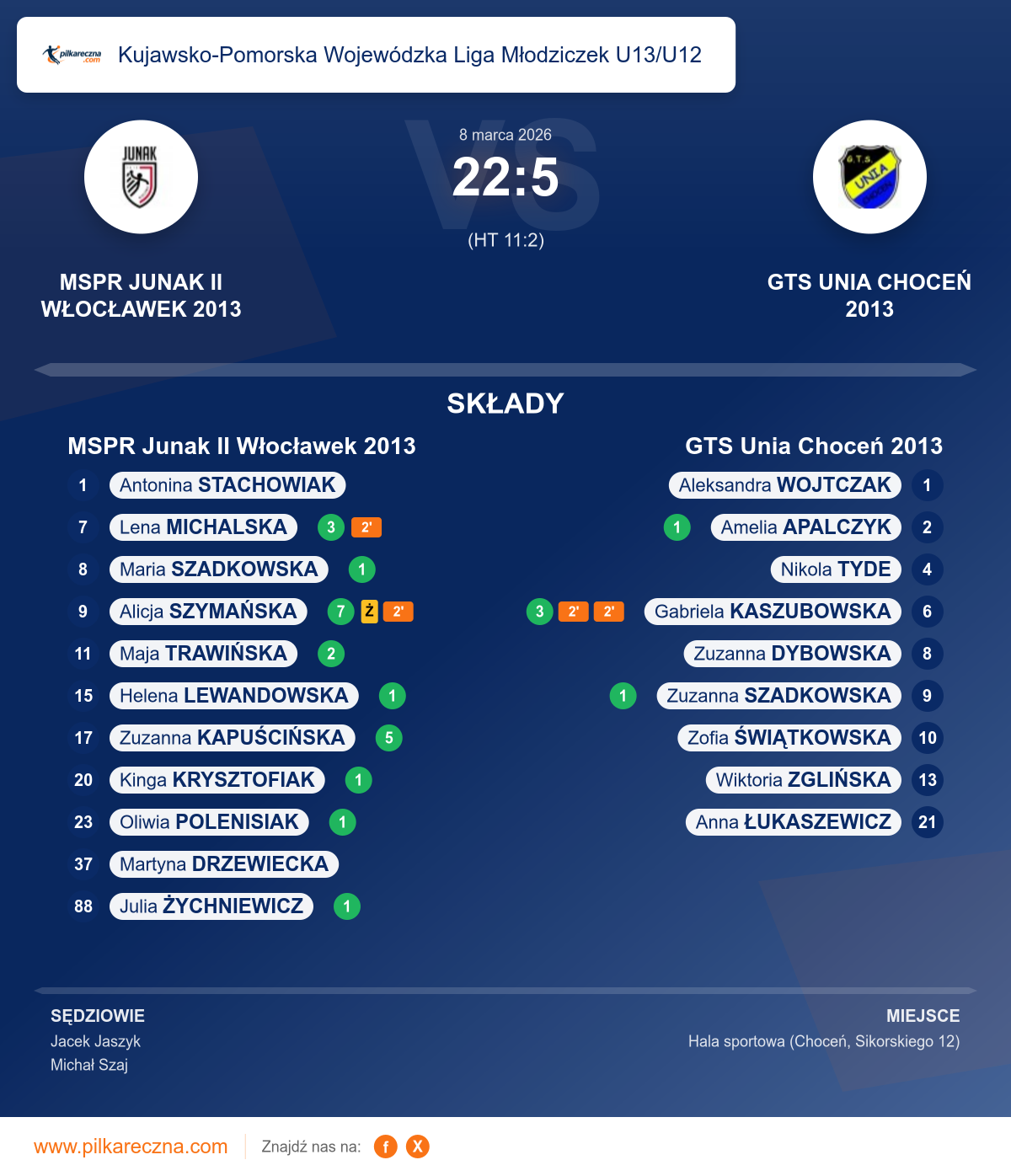 Zawodnicy: Alicja Szymańska (7), Zuzanna Kapuścińska (5), Lena Michalska (3), Maja Trawińska (2), Helena Lewandowska (1), Julia Żychniewicz (1), Kinga Krysztofiak (1), Maria Szadkowska (1), Oliwia Polenisiak (1)