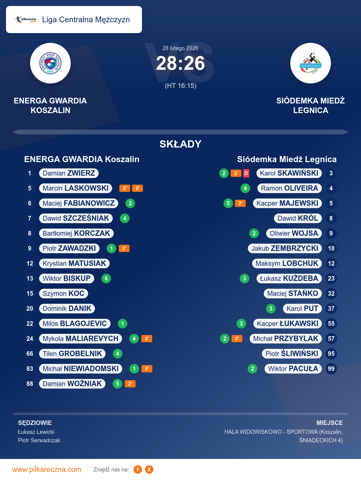 Uwagi: W 57min 59 sek zawodnik zespołu Siódemka Miedz Legnica grający z nr. 3 Karol Skawiński otrzymał karę dyskwalifikacji zgodnie z przepisem 8:5A