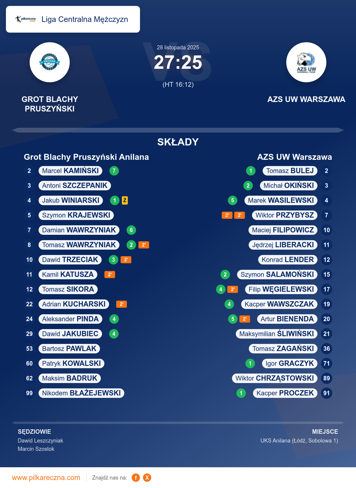 Grot Blachy Pruszyński Anilana 27–25 AZS UW Warszawa