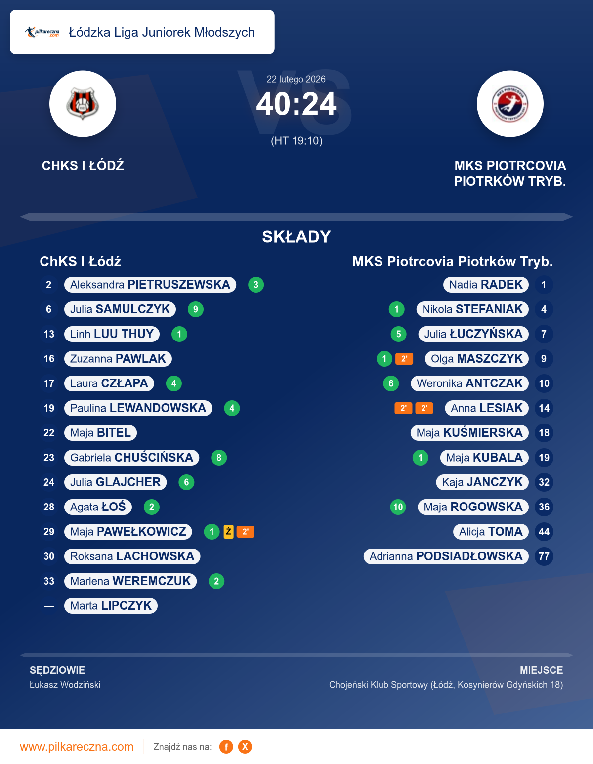 Uwagi: W 55 minucie meczu zawodniczka zespołu CHKS Łódź, nr 6, Julia Samulczyk doznała kontuzji prawej nogi.