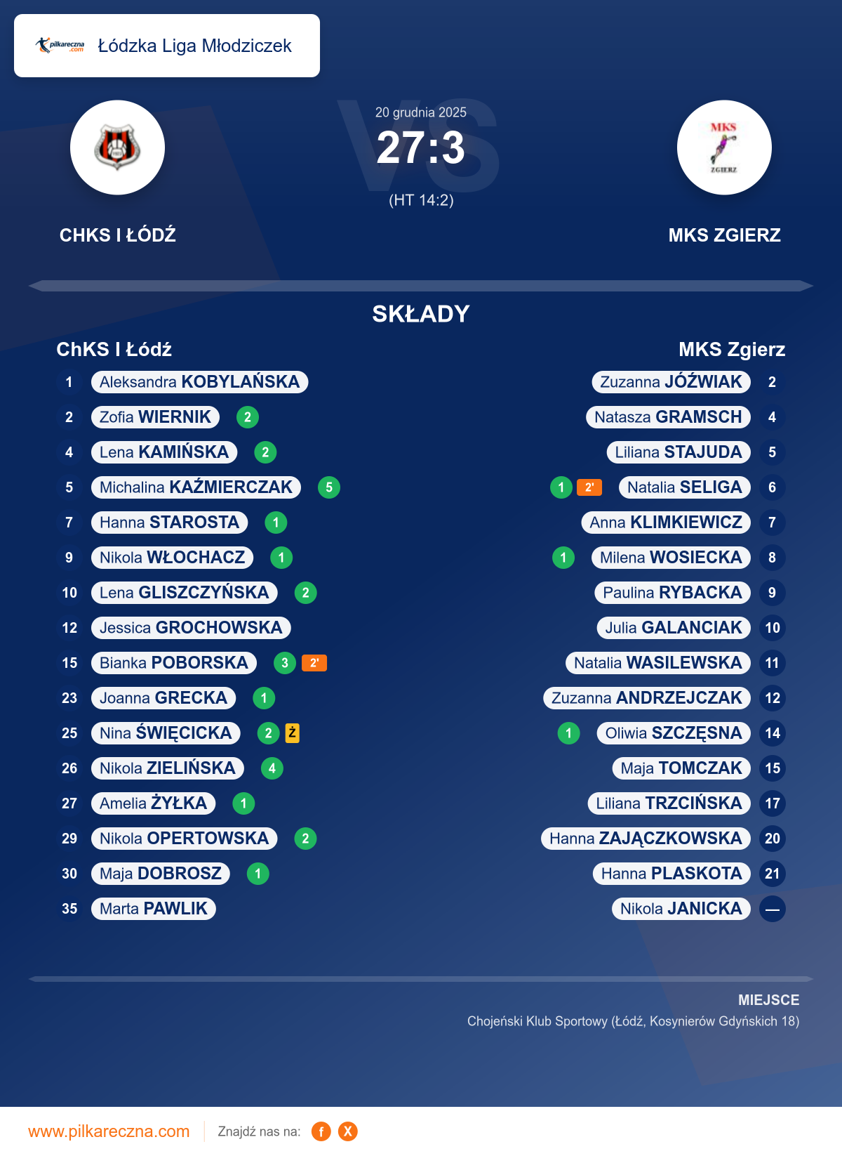 Zawodnicy: Michalina Kaźmierczak (5), Nikola Zielińska (4), Bianka Poborska (3), Lena Gliszczyńska (2), Lena Kamińska (2), Nikola Opertowska (2), Nina Święcicka (2), Zofia Wiernik (2), Amelia Żyłka (1), Hanna Starosta (1), Joanna Grecka (1), Maja Dobrosz (1), Nikola Włochacz (1), Marta Pawlik