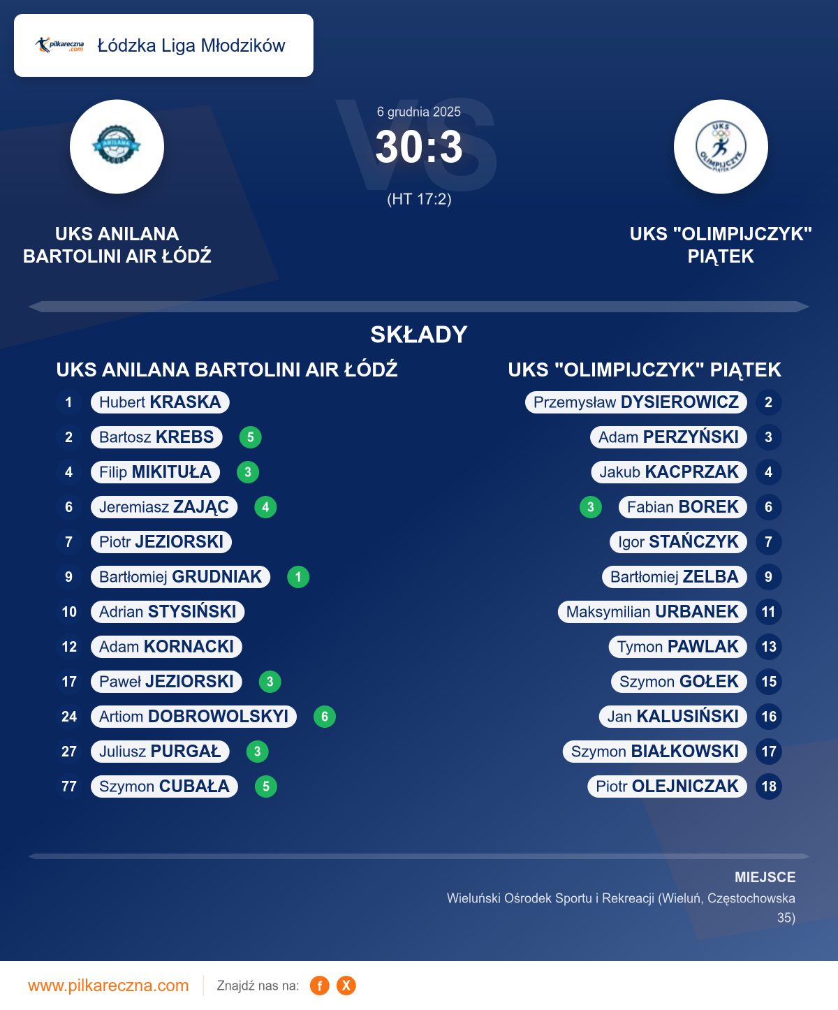 UKS ANILANA BARTOLINI AIR ŁÓDŹ 30–3 UKS "OLIMPIJCZYK" PIĄTEK