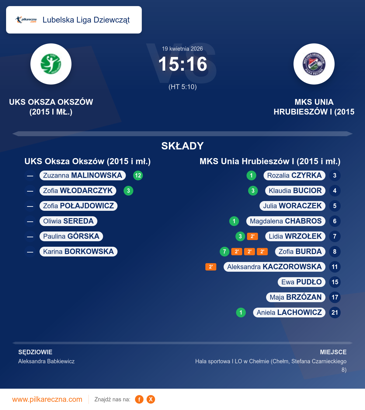 UKS Oksza Okszów (2015 i mł.) 15–16 MKS Unia Hrubieszów I (2015 i mł.)