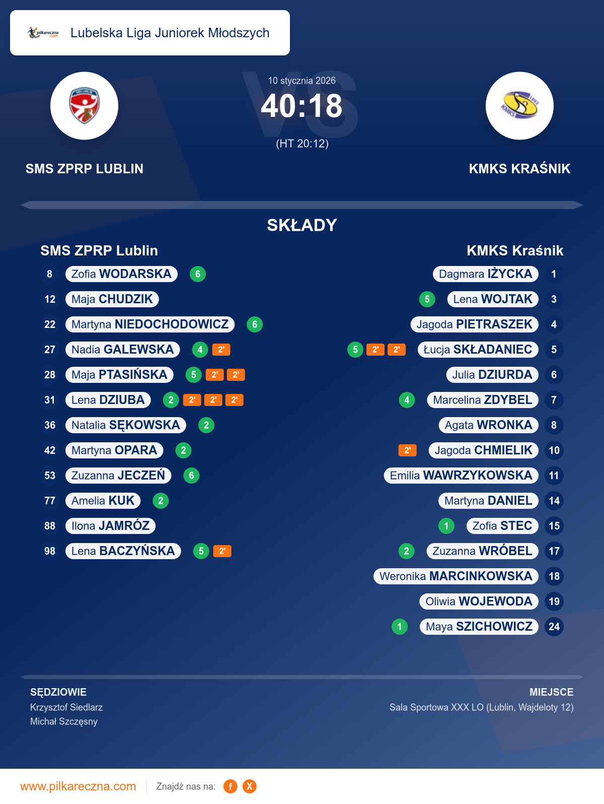 Uwagi: ZAWODNICZKA DRUŻYNY GOSCI KMKS KRAŚNIK Z NR 10 CHMIELIK DOZNAŁA URAZU BRZUCHA. ZOSTAŁA UDZIELONA POMOC.
