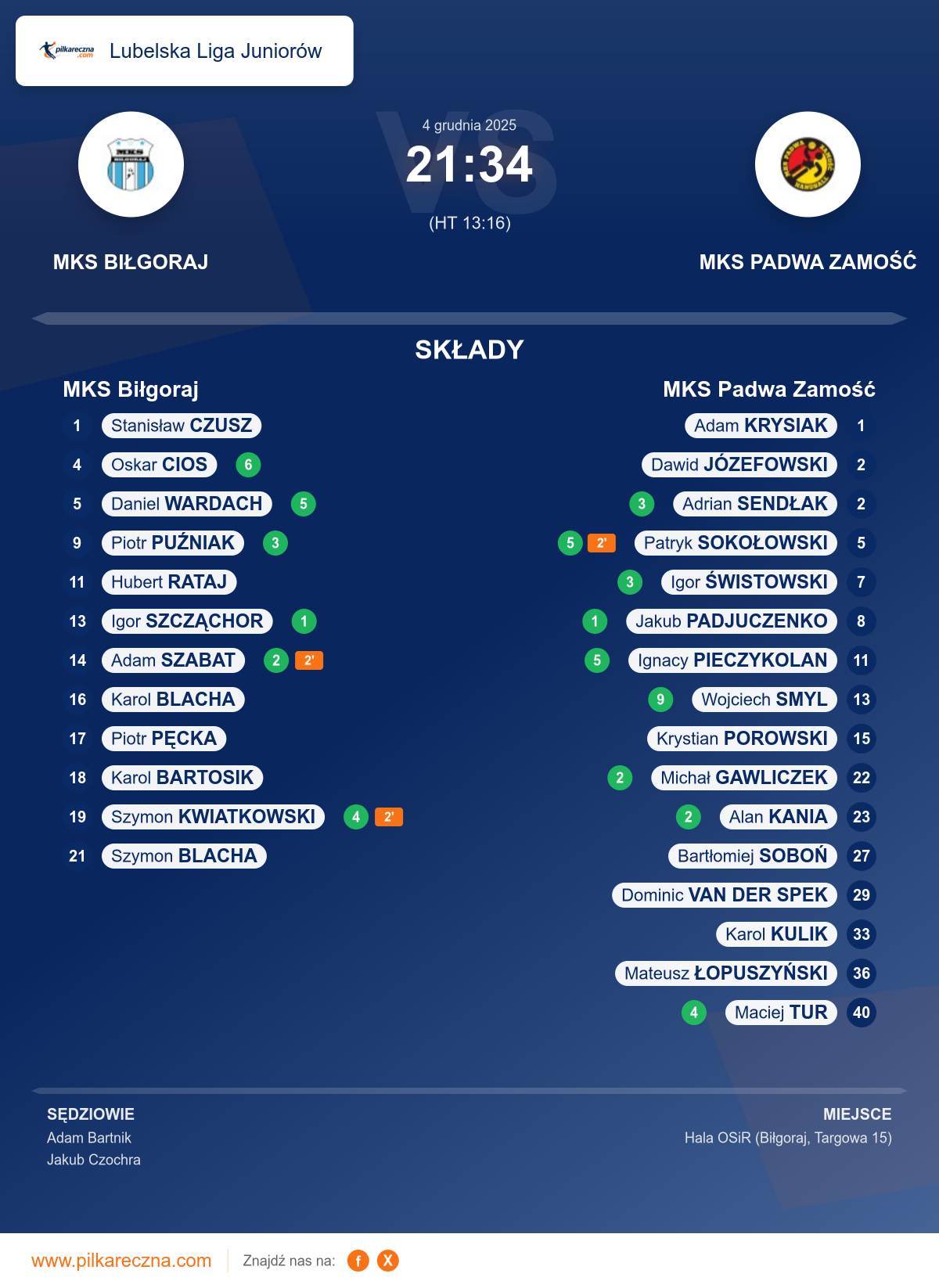 Sędziowali: Adam Bartnik, Jakub Czochra