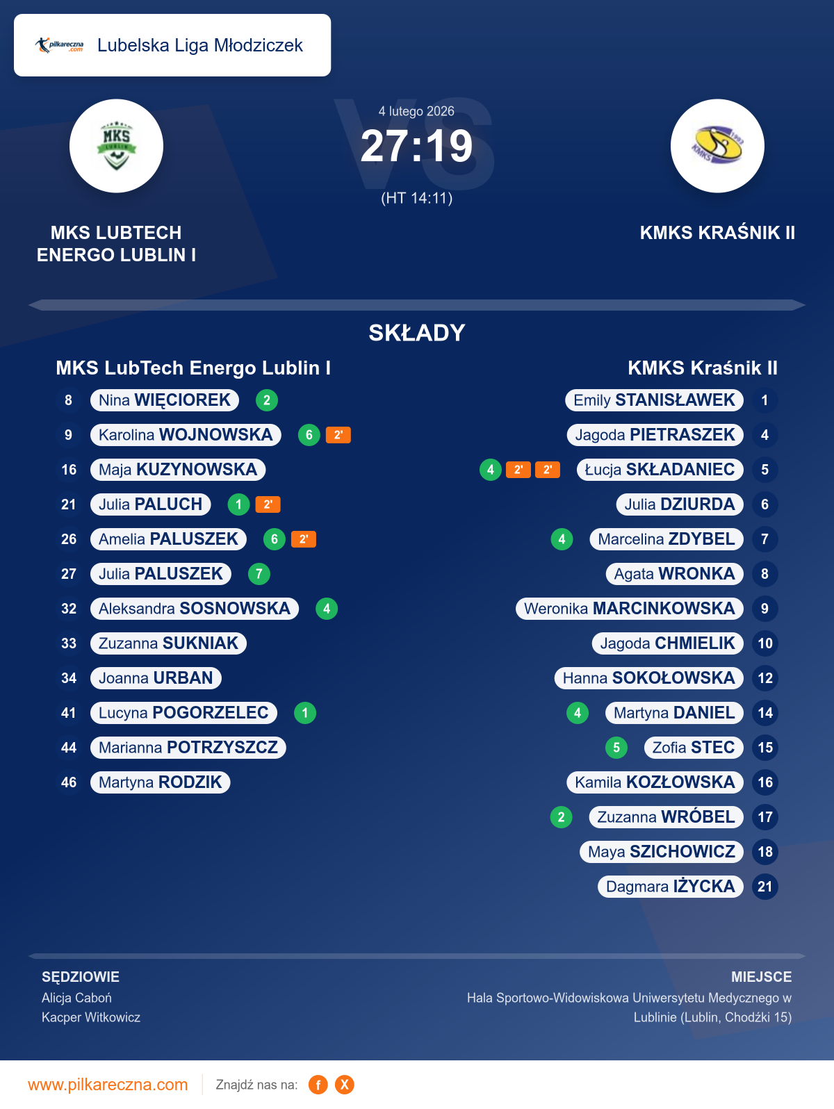 Zawodnicy: Julia Paluszek (7), Amelia Paluszek (6), Karolina Wojnowska (6), Aleksandra Sosnowska (4), Nina Więciorek (2), Julia Paluch (1), Lucyna Pogorzelec (1), Joanna Urban, Marianna Potrzyszcz, Martyna Rodzik, Zuzanna Sukniak