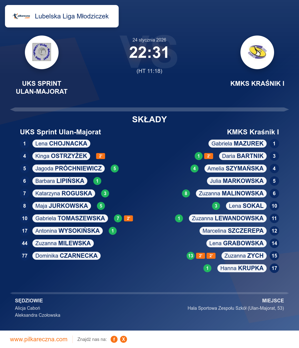 Zawodnicy: Zuzanna Zych (13), Zuzanna Malinowska (8), Amelia Szymańska (4), Lena Sokal (3), Daria Bartnik (1), Hanna Krupka (1), Zuzanna Lewandowska (1), Julia Markowska, Lena Grabowska, Marcelina Szczerepa