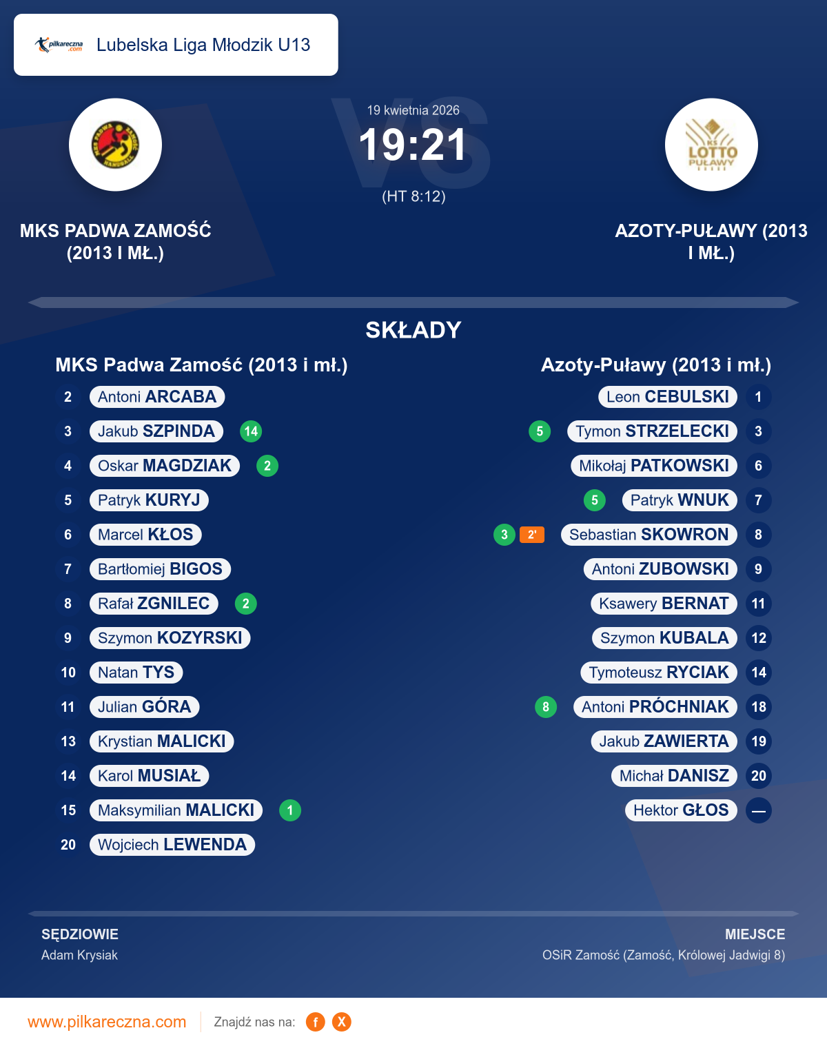Zawodnicy: Jakub Szpinda (14), Oskar Magdziak (2), Rafał Zgnilec (2), Maksymilian Malicki (1), Antoni Arcaba, Bartłomiej Bigos, Julian Góra, Karol Musiał, Krystian Malicki, Marcel Kłos, Natan Tys, Patryk Kuryj, Szymon Kozyrski