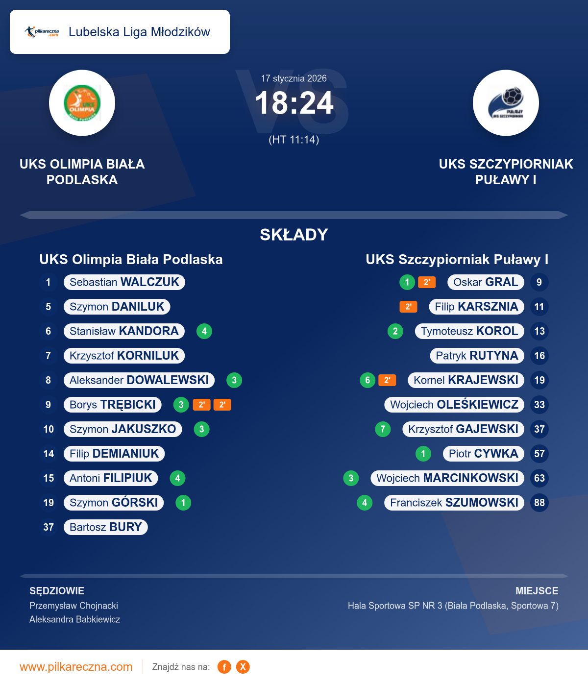 Uwagi: TRENER GOSPODARZY UKS OLIMPIA BIAŁA PODLASKA ZOSTAŁ UKARANY UPOMNIENIEM W 9 MIN. MECZU ZGODNIE Z PRZEPISEM 8:7A ZA WERBALNE PROTESTOWANIE PRZECIWKO DECYZJI SĘDZIÓW.