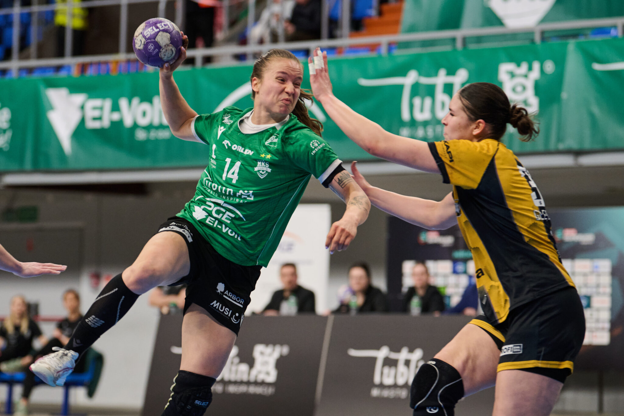 Rywalki nie zamierzały jednak składać broni. Napędzane skutecznymi akcjami Katarzyny Cygan i Weroniki Wabińskiej, szczypiornistki z Gniezna systematycznie odpowiadały na trafienia Lublinek. W ofensywie gospodyń dobrze wyglądały Aleksandra Rosiak i Daria Przywara – obie rozgrywające kontrolowały tempo gry i z powodzeniem penetrowały obronę przeciwniczek. Do przerwy na tablicy wyników widniał wynik 20:16 dla El-Voltu.