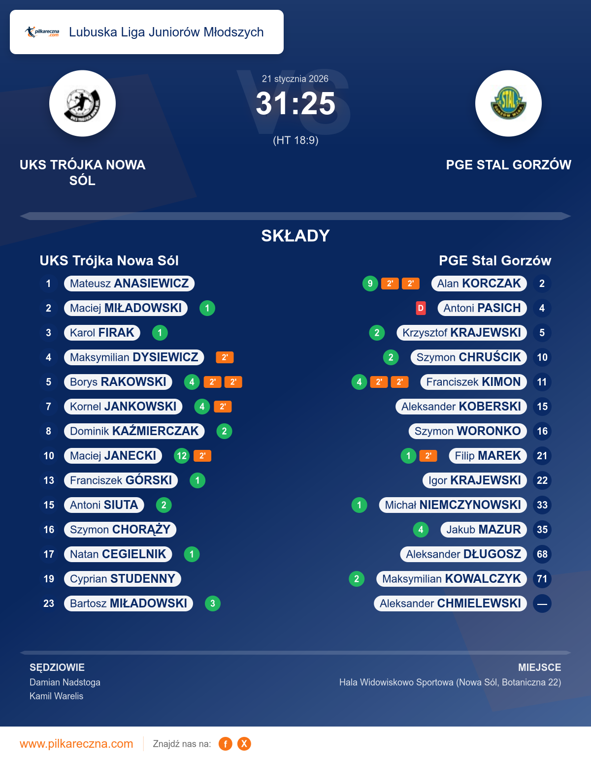 Sędziowali: Damian Nadstoga, Kamil Warelis