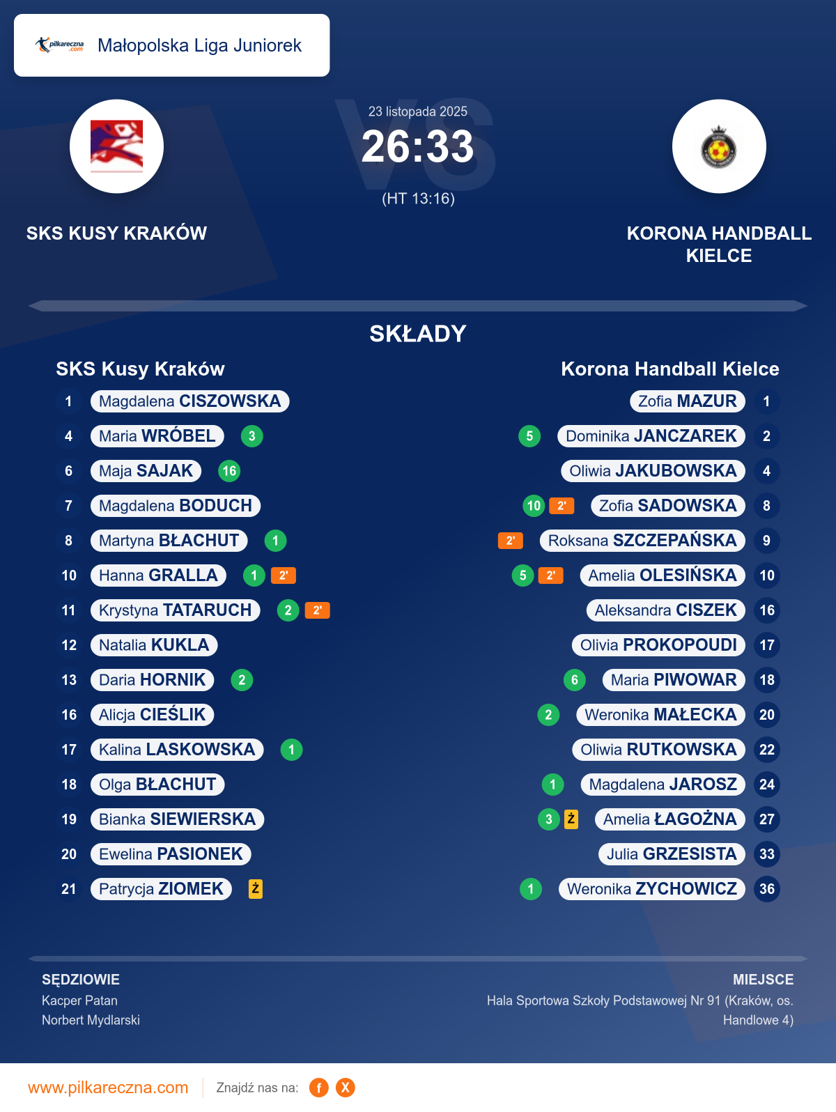 SKS Kusy Kraków 26–33 Korona Handball Kielce