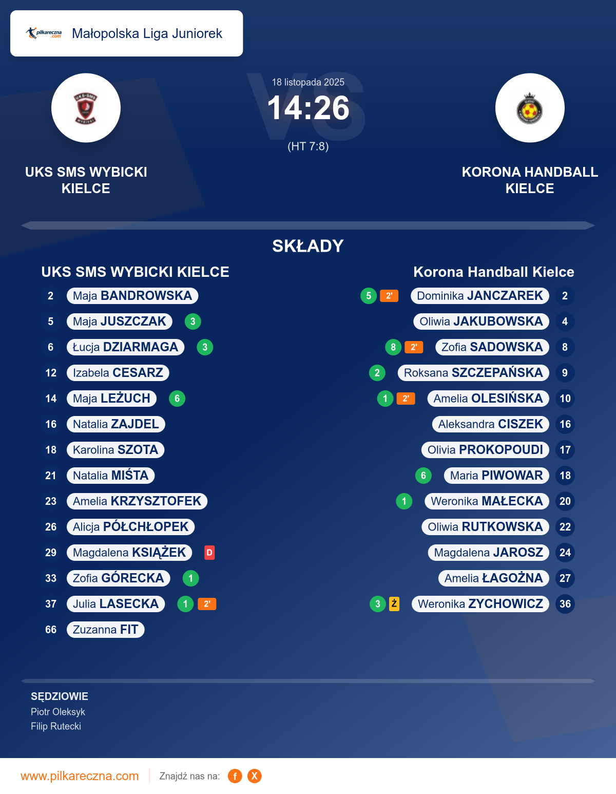 Uwagi: W 20 minucie meczu trener druzyny B (KORONA HANDBALL KIELCE) otrzymal upomnienie zgodnie z przepisem 8.7a (krytykowanie decyzji sedziow). W 30.30 meczu zawodniczka zespolu A (UKS SMS WYBICKI KIELCE) grajaca z numerem 29 (KSIAZEK MAGDALENA) otrzymala kare dyskwalifikacji zgodnie z przepisem 8.5a (spowodowanie utraty kontroli nad ruchami przeciwnika podczas ruchu.)