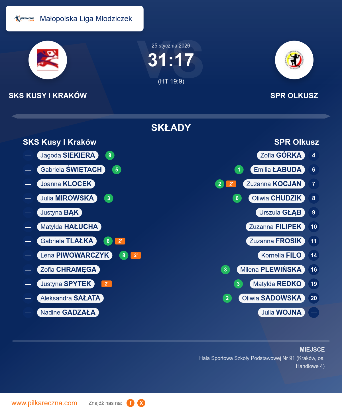 Zawodnicy: Oliwia Chudzik (6), Matylda Redko (3), Milena Plewińska (3), Oliwia Sadowska (2), Zuzanna Kocjan (2), Emilia Łabuda (1), Kornelia Filo, Urszula Głąb, Zofia Górka, Zuzanna Filipek, Zuzanna Frosik