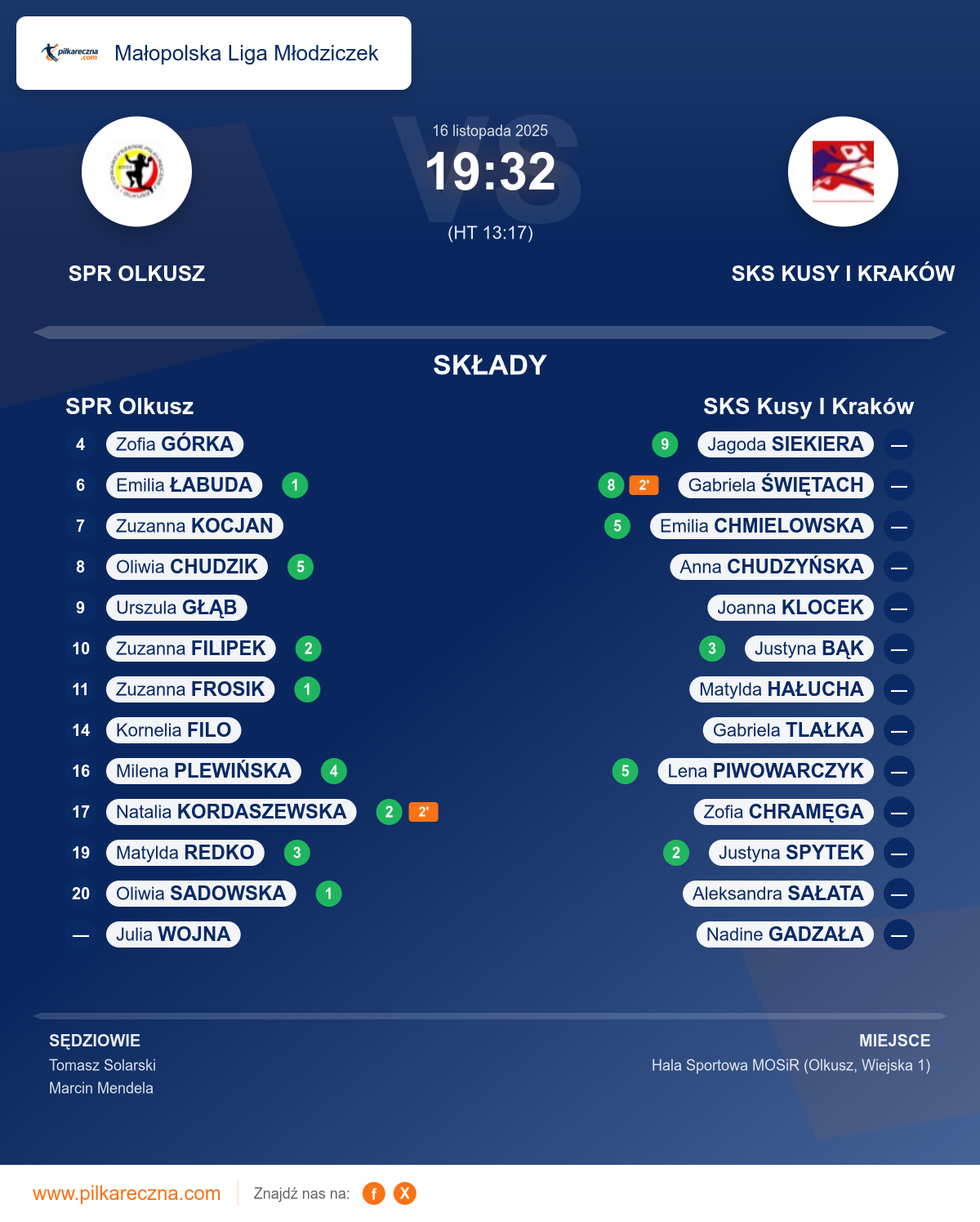 Zawodnicy: Oliwia Chudzik (5), Milena Plewińska (4), Matylda Redko (3), Natalia Kordaszewska (2), Zuzanna Filipek (2), Emilia Łabuda (1), Oliwia Sadowska (1), Zuzanna Frosik (1), Kornelia Filo, Urszula Głąb, Zofia Górka, Zuzanna Kocjan