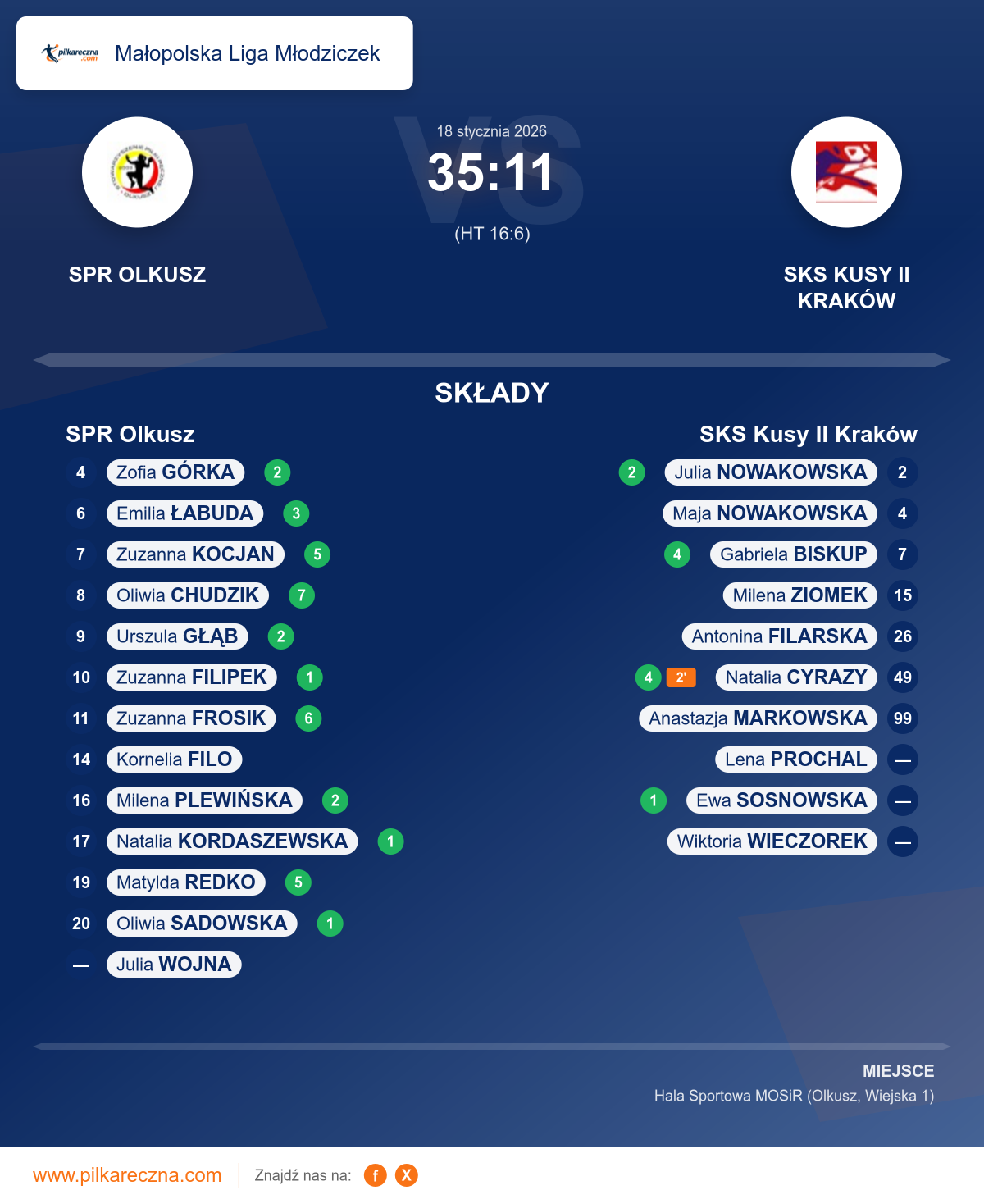 Zawodnicy: Oliwia Chudzik (7), Zuzanna Frosik (6), Matylda Redko (5), Zuzanna Kocjan (5), Emilia Łabuda (3), Milena Plewińska (2), Urszula Głąb (2), Zofia Górka (2), Natalia Kordaszewska (1), Oliwia Sadowska (1), Zuzanna Filipek (1), Kornelia Filo
