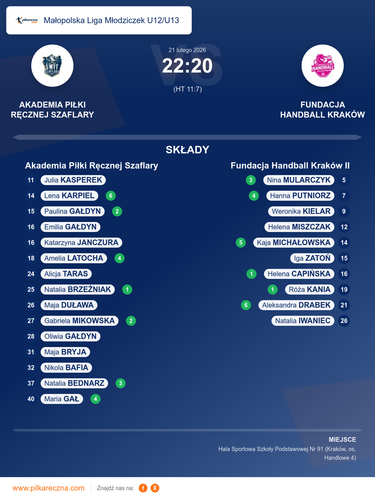 Akademia Piłki Ręcznej Szaflary 22–20 Fundacja Handball Kraków II