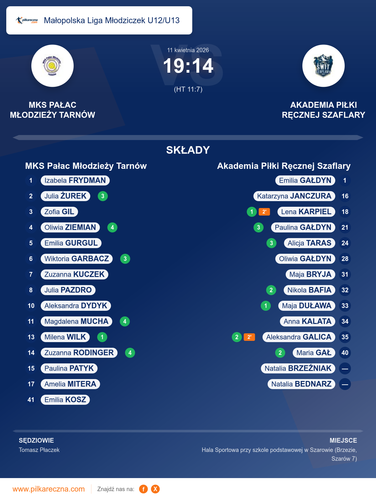 MKS Pałac Młodzieży Tarnów 19–14 Akademia Piłki Ręcznej Szaflary